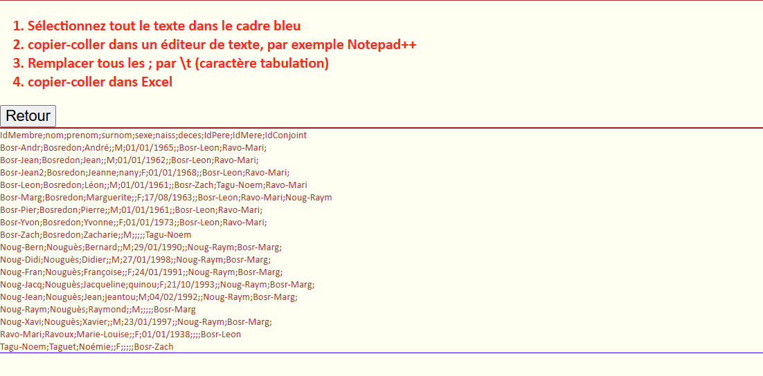Édition de la liste des descendants ou membres apparenté du membre courant
